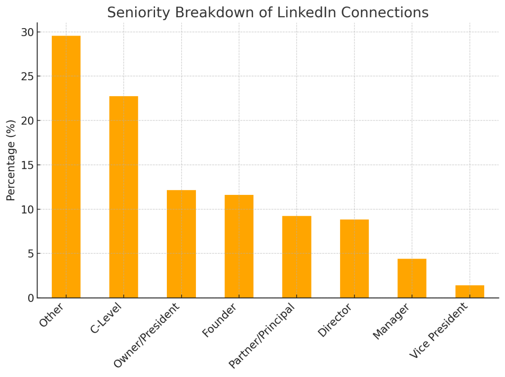 My LinkedIn community isn’t just large—it’s influential. Nearly half of my connections (46%+) hold senior decision-making roles:
